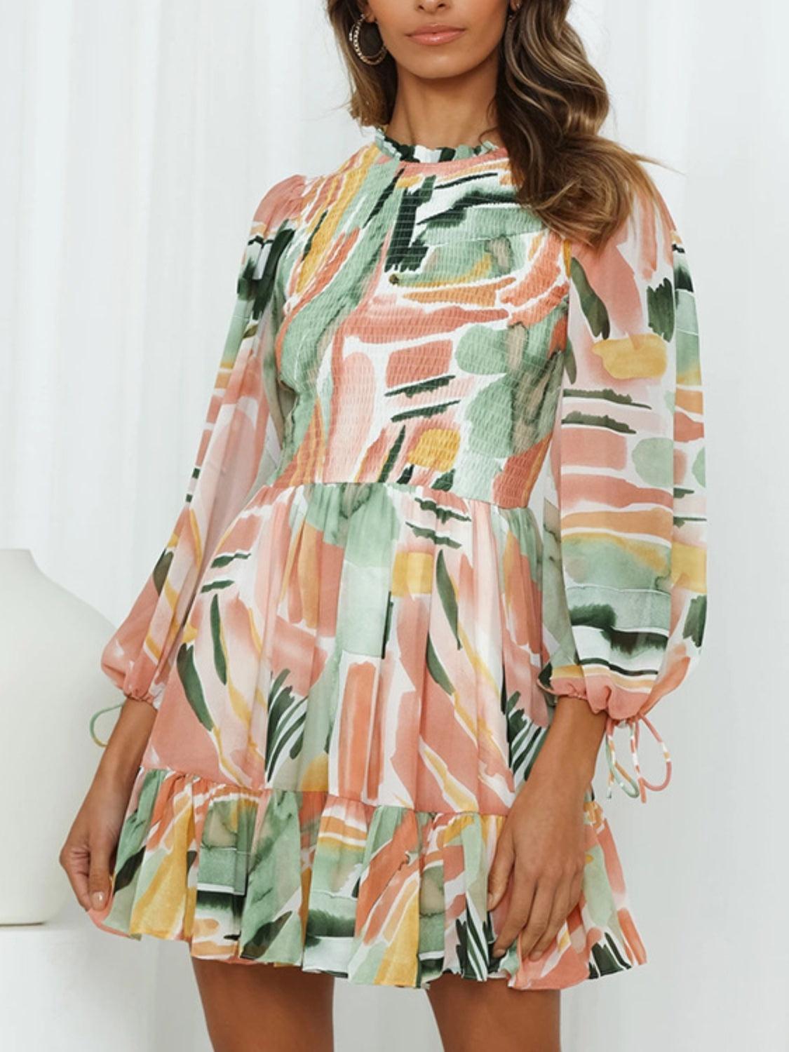 Printed Mock Neck Balloon Sleeve Mini Dress
